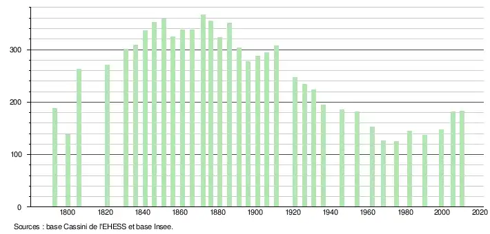 L'évolution du nombre d'habitants est connue à travers les recensements de la population effectués dans la commune depuis 1793. À partir du , les populations légales des communes sont publiées annuellement dans le cadre d'un recensement qui repose désormais sur une collecte d'information annuelle, concernant successivement tous les territoires communaux au cours d'une période de cinq ans. Pour les communes de moins de 10 000 habitants, une enquête de recensement portant sur toute la population est réalisée tous les cinq ans, les populations légales des années intermédiaires étant quant à elles estimées par interpolation ou extrapolation[3]. Pour la commune, le premier recensement exhaustif entrant dans le cadre du nouveau dispositif a été réalisé en 2005[4],[Note 1].