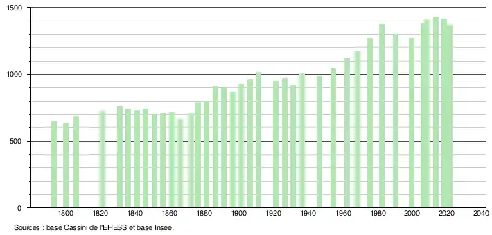 L'évolution du nombre d'habitants est connue à travers les recensements de la population effectués dans la commune depuis 1793. Pour les communes de moins de 10 000 habitants, une enquête de recensement portant sur toute la population est réalisée tous les cinq ans, les populations légales des années intermédiaires étant quant à elles estimées par interpolation ou extrapolation[40]. Pour la commune, le premier recensement exhaustif entrant dans le cadre du nouveau dispositif a été réalisé en 2008[41].