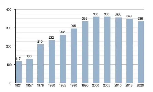 Ce graphique reprend le nombre d'habitants du village au 1er janvier de chaque année selon le site internet officieux du village pour les années 1821 et 1957[3], ainsi que selon registre officiel de la population de la commune d'Aubange, consulté en pour les autres années.