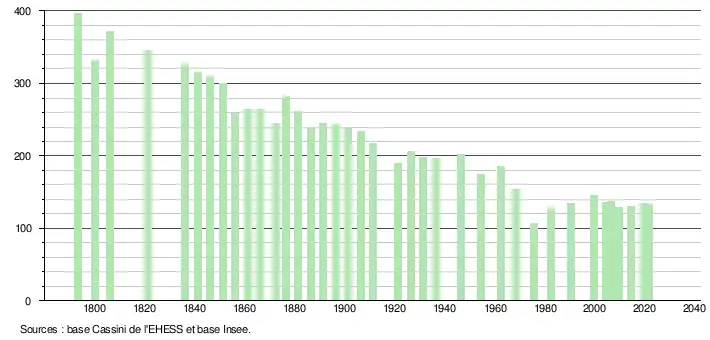 L'évolution du nombre d'habitants est connue à travers les recensements de la population effectués dans la commune depuis 1793. Pour les communes de moins de 10 000 habitants, une enquête de recensement portant sur toute la population est réalisée tous les cinq ans, les populations légales des années intermédiaires étant quant à elles estimées par interpolation ou extrapolation[23]. Pour la commune, le premier recensement exhaustif entrant dans le cadre du nouveau dispositif a été réalisé en 2004[24].