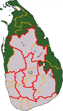 Situation en . En rouge, zones contrôlées par les LTTE. En orange, zones contrôlées par le gouvernement avec des poches contrôlées par les LTTE. En jaune, zones contrôlées par le gouvernement et revendiquées par les LTTE pour un État tamoul indépendant.