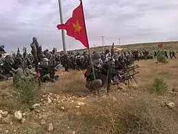 Les Kurdes de Syrie ont également protesté contre les discriminations ethniques et la négation de leur identité culturelle et de leur langue[77],[78]. Ils constituent 8,5 à 11 % des syriens. Ils ne constituent pas une confession en soi, mais sont majoritairement sunnites. Ils sont regroupés au nord-est du pays sur la frontière turque, ainsi que dans la province d'Alep, le Jazirah et la banlieue de Damas. Cette population au fort sentiment communautaire met à profit l’affaiblissement de l'armée syrienne en pour investir plusieurs villes du Nord du pays[79]. Elle est soutenue par l'espoir, entretenu par le PKK, de la création d'un Kurdistan indépendant.