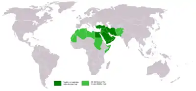 Outre l'Irak, Washington se focalise alors essentiellement sur la Syrie et l’Iran. Bush considère en effet qu'ils soutiennent les filières terroristes en Irak (notamment en accusant Damas de laisser passer des « djihadistes » à travers ses frontières), ainsi qu'en Palestine: la visée de la guerre contre le terrorisme dépasse une nouvelle fois la cible précise d'Al-Qaïda, pour englober l'islamisme en général, et en particulier le Hamas (sunnite) et le Hezbollah (chiite). Bien plus: le projet néoconservateur de « remodelage » du Grand Moyen-Orient inclut, outre le Moyen-Orient et l'Iran, la péninsule arabique, le Maghreb, le Machrek, la Turquie et le Pakistan, voire aussi la Mauritanie (en Algérie, affecté par une guerre civile sanglante dans les années 1990 à la suite de la victoire électorale du Front islamique du salut et à l'interruption du processus électoral par les généraux algériens, le Groupe salafiste pour la prédication et le combat, GSPC, surfant sur la popularité de Ben Laden, se rebaptise Al-Qaïda au pays du Maghreb islamique en janvier 2007). Cette vision globale a été critiquée par plusieurs observateurs: d'une part, elle concurrençait en partie le partenariat Euro-Méditerranéen déjà à l'œuvre depuis une dizaine d'années, suscitant des crispations en Europe[23]; d'autre part, sa pertinence géopolitique et stratégique était mise en doute. En effet, cette zone ne coïncide ni avec le monde musulman, excluant notamment l'Indonésie, ni avec le monde arabe, incluant l'Iran (Perse) ou la Turquie.