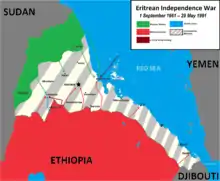 En , des militants du Front de libération du peuple du Tigray, proche du FPLE et soutenus par les États-Unis[réf. nécessaire], renversent le Derg. Un gouvernement provisoire est mis en place. Des pourparlers de paix se déroulent alors à Washington, aux États-Unis. L'Éthiopie reconnaît le droit de l'Érythrée à organiser un référendum, qui aboutit à l'indépendance du pays le .