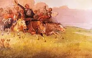 La cavalerie était peu nombreuse au début, car elle avait été peu représentée dans les régiments levés sur la base des milices urbaines de Buenos Aires et que les criollos avaient tendance à dédaigner la cavalerie. Son usage, limité à des opérations de protection sur les flancs des formations d’infanterie[25], était de peu d’efficacité, faute d’entraînement approprié en manœuvre et tactique et en raison de ce que les criollos privilégiaient les carabines et tenaient la lance pour une arme des indigènes, ce qui, eu égard aux caractéristiques des armes à feu de l’époque, constituait une véritable erreur. Cependant, le recrutement de milices de cavalerie devait s’étendre rapidement vers la population rurale des provinces intérieures et son prestige grandir à la suite de la création du Régiment de grenadiers à cheval (Regimiento de Granaderos a Caballo), corps de cavalerie spécialisée en affrontements armés à grande vitesse[26]. La supériorité dont la cavalerie patriote bénéficia à partir de ce moment, et qui était redevable à l’habileté de ses cavaliers, se maintint durant tout le reste de la guerre.