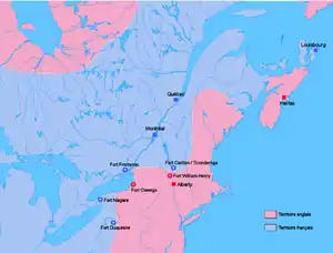 En ce qui concerne l’Amérique du Nord[23], un conflit larvé est en cours depuis 1743, et des combats sérieux ont eu lieu en 1755 (bataille de la Monongahela et bataille du lac George). En , Montcalm, arrivé en avril, lance une attaque victorieuse contre le fort Oswego, position britannique avancée sur la rive sud du lac Ontario, ce qui amène la Grande-Bretagne à mettre en place un blocus contre les colonies françaises d’Amérique du Nord.