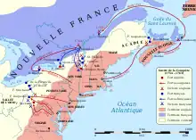 La situation en Amérique du Nord pose aussi des problèmes : l'émigration de sujets français vers la Nouvelle-France est trop limitée et ne permet pas à la France d’assurer le contrôle réel et la défense de son empire colonial. Les pertes de territoires qui ont eu lieu à la suite de la guerre de Succession d'Espagne[12] ont sérieusement amputé les possessions françaises, mais l’ambition d’étendre la domination sur le continent américain demeure.