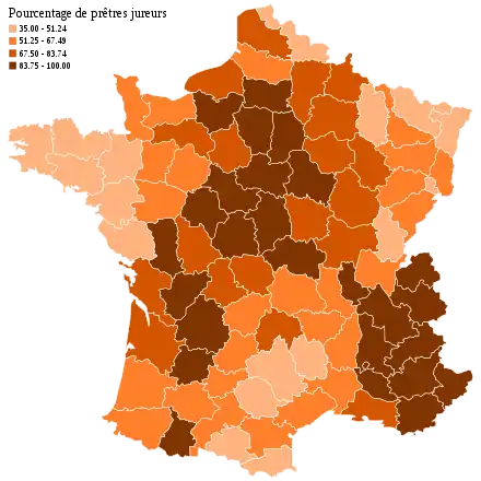 Dans ce contexte, l'Assemblée législative prend, en novembre 1791 et le , des décrets répressifs contre le clergé réfractaire, dont le culte est interdit. Le second prévoit la déportation hors du territoire français de tout prêtre réfractaire sur la simple demande de 20 citoyens. À la veille du 10 août 1792, lorsque l'Assemblée supprime les dernières congrégations existantes, une bonne partie sont emprisonnés. Obligés de se cacher, afin d'éviter la déportation au bagne en Guyane, les prêtres non jureurs sont protégés par des femmes, qui participent à des messes clandestines. Malgré ces mesures, le nouveau clergé constitutionnel n'arrive pas à s'imposer dans une large partie de la région. Les assermentés représentent, selon Michel Vovelle, 0 à 35 % des prêtres en Vendée et en Loire-Inférieure (comme l'ensemble de la Bretagne), contre 35 à 55 % en Maine-et-Loire et 75 à 100 % dans les Deux-Sèvres, en 1791. Dans l'ensemble, plus de 65 % du clergé refuse de prêter serment dans l'Ouest (contre 48 % au niveau national)[22]. Autour de Châtillon et de Bressuire, une zone globalement homogène de refus se distingue. La religion des paysans de l'Ouest, comme en bien d'autres endroits, est une religion propitiatoire (visant à assurer l'abondance des récoltes, la fécondité du bétail, la réalisation d'un mariage, la naissance d'un enfant, la guérison d'une maladie, etc.), qui organise le calendrier et le paysage, avec un appel aux saints spécialisés, à leurs chapelles, avec des rites particuliers. De même, la carrière ecclésiastique représente un moyen de promotion sociale pour bien des familles paysannes, un moyen que l'exclusion des prêtres réfractaires menace[23].