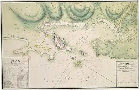 À l’automne 1758, Bougainville, trompant le blocus sur un petit navire corsaire, vient demander des renforts en dressant un portrait très sombre de la situation à Québec[67]. Il repart en avec un petit convoi de vivres et 400 soldats, juste à temps pour participer à la défense de la ville assaillie en par vingt-deux vaisseaux, vingt-deux frégates et soixante-dix bâtiments de charge porteurs d’une armée de 10 000 hommes[68]. Des brûlots sont lancés contre les bâtiments britanniques. En vain. Québec capitule le 18 septembre, après un long siège et une bataille mémorable (voir ci-dessous).