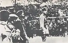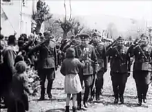 Comités d'action bulgares – Après la défaite de l'armée yougoslave, un groupe de Bulgares macédoniens dirigé par Spiro Kitincev est arrivé en Macédoine et a commencé à préparer l'arrivée de l'armée et de l'administration bulgares en Macédoine[36]. Le premier des comités d'action bulgare a été formé à Skopje le 13 avril 1941. Les anciens membres de l'IMRO[37],[38] de Vardar Macédoine étaient des membres actifs de ce comité. Le 13 avril 1941, lors d'une réunion à Skopje, il fut décidé que l'une des premières tâches de l'organisation nouvellement formée était de régler les relations avec les autorités allemandes[39]. Lorsque l'armée bulgare est entrée en Macédoine du Vardar le 19 avril 1941, elle a été accueillie par la plupart de la population locale comme des libérateurs, car les sentiments anti-serbes et pro-bulgares prévalaient au sein de la population locale à cette époque[39],[40],[41],[42],[43]. Avec l'intercession des comités et de l'administration bulgare, plus de 12 000 prisonniers de guerre yougoslaves macédoniens qui avaient été enrôlés dans l'armée yougoslave ont été libérés par les autorités allemandes, italiennes et hongroises[44]. Avec l'arrivée de l'armée bulgare, l'expulsion massive des colons serbes du Vardar Macédoine a eu lieu[44]. Une fois la région et l'administration organisées, les comités d'action se sont marginalisés et ont finalement été dissous[45].