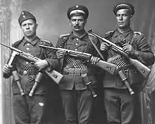 Counter-chetas – Les Kontračeti étaient des unités anti-partisanes organisées et équipées par la police bulgare entre 1942 et 1944. Composée d'anciens militants de l'IMRO, la première kontračeta a été formée à Veles à la fin de 1942 afin de limiter les activités partisanes et du mouvement tchetnik serbe dans la région. L'idée de la formation de ces unités est venue de Stefan Simeonov, chef de la police du district de Skopje, et du vormer Internal Dobrujan Revolutionary Organization četnik, et a été approuvée par le ministre de l'Intérieur Petur Gabrovski[36]. Leur force maximale était de 200 unités en août 1944[51].