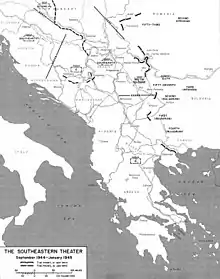 Sous la direction du nouveau gouvernement bulgare pro-soviétique, quatre armées bulgares, fortes de 455 000 au total, sont mobilisées et réorganisées. Fin septembre, les troupes du 3e front ukrainien de l'Armée rouge étaient concentrées à la frontière bulgaro-yougoslave. Au début d'octobre 1944, trois armées bulgares, composées d'environ 340 000 hommes[106], ainsi que l'Armée rouge sont rentrées en Yougoslavie occupée et se sont déplacées de Sofia à Niš, Skopje et Pristina pour bloquer le retrait des forces allemandes de Grèce[107],[108]. En Macédoine, les Bulgares ont opéré en collaboration avec les combattants du MNLA, mais cette coopération ne s'est pas déroulée sans difficultés[109]. Du 8 octobre au 19 novembre, l'opération Stratsin-Kumanovo a eu lieu et Kratovo, Kriva Palanka, Kumanovo et Skopje[110] ont été prises. Dans le même temps, l'opération Bregalnitsa-Strumica était menée, et la Wehrmacht était chassée des villages de Delchevo, Kočani, Štip, Strumica et Veles[111]. En parallèle, l'opération Kosovo avait également lieu, visant à expulser les forces allemandes du Kosovo. La Serbie méridionale et orientale, le Kosovo et la Macédoine du Vardar ont été libérés fin novembre[112],[113]. Le 3e Front ukrainien en collaboration avec l'Armée populaire de libération de la Yougoslavie et l'Armée populaire bulgare a mené l'offensive de Belgrade. La première armée bulgare, forte de 130 000 hommes, a continué vers la Hongrie, chassant les Allemands, tandis que le reste est retourné en Bulgarie. Sur une série de cartes du groupe d'armées E, montrant son retrait à travers la Macédoine et la Serbie du Sud, ainsi que dans les mémoires de son chef d'état-major, il n'y a presque aucune indication d'unités partisanes yougoslaves, mais seulement des divisions bulgares. Malgré ces faits, la contribution des troupes bulgares est encore très débattue en République de Macédoine pour des raisons politiques[114],[115]
