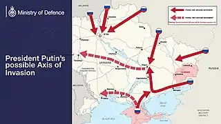 Le , The Times rapporte que le chef de l'Opération des forces conjointes, le lieutenant-général Oleksandr Pavliouk, a déclaré au journaliste britannique Anthony Loyd (en) à Popasna que les Russes commenceraient l'invasion le [126]. Les exercices militaires conjoints russo-biélorusses doivent se terminer à cette date, tout comme les Jeux olympiques d'hiver de 2022 à Pékin ; selon The Times, Poutine ne souhaite peut-être pas gâcher le spectacle de son allié chinois potentiel[126]. Selon Pavliouk, les Russes avaient déjà déployé 54 groupes tactiques de bataillon (BTG), et Kiev est désormais à portée de certains des 36 systèmes de missiles balistiques à courte portée Iskander dont ces BTG sont équipés[126]. Pavliouk déclare que les Russes attaqueront probablement depuis plusieurs directions afin de s'emparer de huit régions orientales de l'Ukraine et de couper l'accès à la mer Noire. Une telle invasion — occupant les villes de Kharkiv, Odessa et Dnipro — donnerait à la Russie la plupart des capacités militaires et industrielles de l'Ukraine[126].