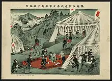 Le , le Japon adresse un ultimatum à la Russie au sujet de la Mandchourie. N'ayant pas obtenu de réponse, le Japon attaque par surprise l'escadre navale de Port-Arthur le [38]. L'empereur du Japon déclare la guerre à la Russie le . En mars, les forces armées du Japon débarquent en Corée et conquièrent rapidement le pays. Elles exploitent leur avancée et mettent le siège devant Port-Arthur en . Les Russes, quant à eux, se replient sur Moukden[39] (actuel Shenyang). Ils reprennent l'initiative en octobre grâce aux renforts venus par le Transsibérien, mais un commandement incompétent fait échouer les attaques. Port-Arthur capitule en . La ville de Moukden tombe après une bataille meurtrière au mois de mars. Les combats terrestres, qui ont été acharnés et extrêmement meurtriers de part et d'autre (71 000 morts russes et 85 000 morts japonais) sont alors terminés : les Russes n'ont plus de réserves à faire parvenir en Extrême-Orient.