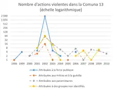 – De 2008 à 2010, les conflits entre groupes de gangs et de paramilitaires reprennent pour le contrôle du territoire dans différentes comunas périphériques de Medellín (109 homicides en 2009 à la Comuna 13)[GMH 2].