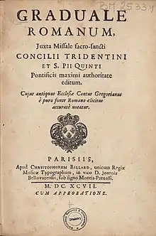 - Antiphonarium Romanum, juxta Breviarium sacro-sancti Concilii Tridentini et Pij Quinti Pontificis maximi authoritate editum. Cujus antiquus Ecclesiæ cantus gregorianus è puro fonte Romano elicitus accuratè notatur. – Paris : Christophe Ballard [ou] Pierre Hérissant [ou] Nicolas Pépié (impr. Christophe Ballard), 1701. 4°. Davy-Rigaux 2004 p. 422. Réédité en 1723.