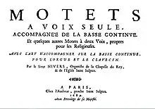 - Motets à voix seule accompagnée de la basse continue et quelques autres motets à deux voix propres pour les Religieuses, avec l’art d’accompagner la basse pour la basse continue pour l’orgue et le clavecin, Paris, l’auteur, 1689. RISM N 715, Davy-Rigaux 2004 p. 416.