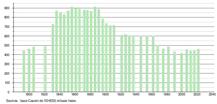 L'évolution du nombre d'habitants est connue à travers les recensements de la population effectués dans la commune depuis 1793. Pour les communes de moins de 10 000 habitants, une enquête de recensement portant sur toute la population est réalisée tous les cinq ans, les populations légales des années intermédiaires étant quant à elles estimées par interpolation ou extrapolation[22]. Pour la commune, le premier recensement exhaustif entrant dans le cadre du nouveau dispositif a été réalisé en 2006[23].