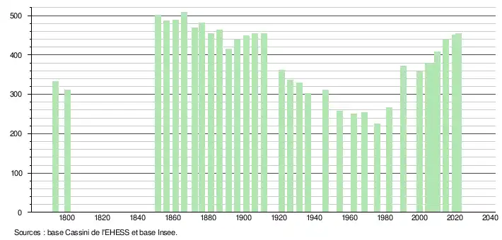 L'évolution du nombre d'habitants est connue à travers les recensements de la population effectués dans la commune depuis 1793. Pour les communes de moins de 10 000 habitants, une enquête de recensement portant sur toute la population est réalisée tous les cinq ans, les populations légales des années intermédiaires étant quant à elles estimées par interpolation ou extrapolation[31]. Pour la commune, le premier recensement exhaustif entrant dans le cadre du nouveau dispositif a été réalisé en 2004[32].