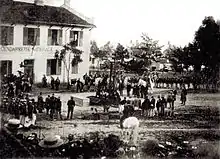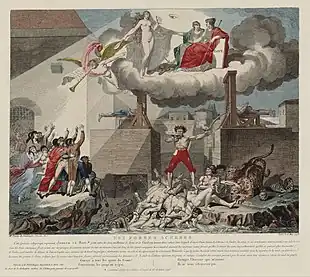 L'échafaud peut comporter une trappe lors des exécutions de groupes. (ici, neuf émigrés sur la place de l'Hôtel de ville).