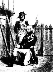Guillotine, modèle Berger 1872, construite vers 1890. L’homme à la droite en est le propriétaire, Fernand Meyssonnier, qui fut premier aide de l'exécuteur à l'époque de l’Algérie française.