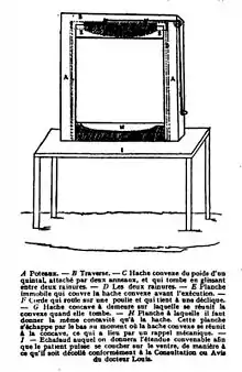Le , Louis dépose auprès de l’Assemblée sa « Consultation motivée sur le mode de décollation nouveau »[16], qui précise : « Il est aisé de construire une pareille machine dont l’effet est immanquable ; la décapitation sera faite en un instant, suivant l’esprit et le vœu de la nouvelle loi ».