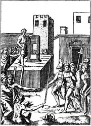 Une gravure de Giulio Bonasone qui illustre l'exécution du Lacédémonien Lacon, avec une « guillotine » d'ailleurs peu détaillée, figure dans le Symbolicae quaestiones de universo genere d’Achille Bocchi, imprimé en 1555.
