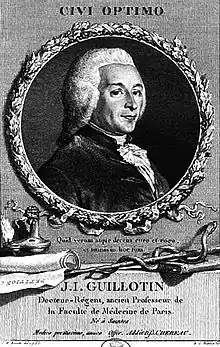 Elle tient son nom du docteur Guillotin qui fait adopter la machine à l'assemblée nationale constituante dans les tout premiers temps de la Révolution française en 1789. Son concepteur est le docteur Antoine Louis. La première machine est réalisée par un facteur allemand de pianos et de clavecins installé à Paris, Tobias Schmidt (de).