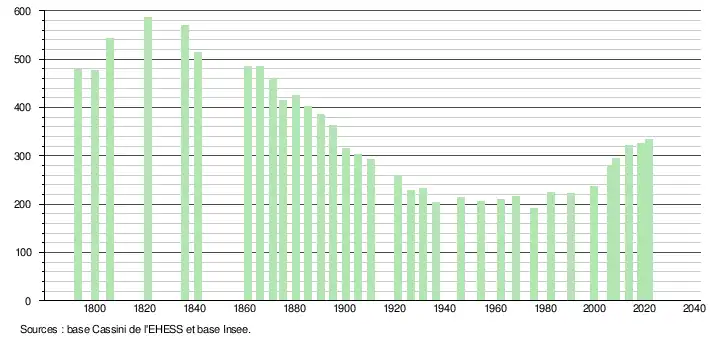 L'évolution du nombre d'habitants est connue à travers les recensements de la population effectués dans la commune depuis 1793. Pour les communes de moins de 10 000 habitants, une enquête de recensement portant sur toute la population est réalisée tous les cinq ans, les populations légales des années intermédiaires étant quant à elles estimées par interpolation ou extrapolation[22]. Pour la commune, le premier recensement exhaustif entrant dans le cadre du nouveau dispositif a été réalisé en 2008[23].