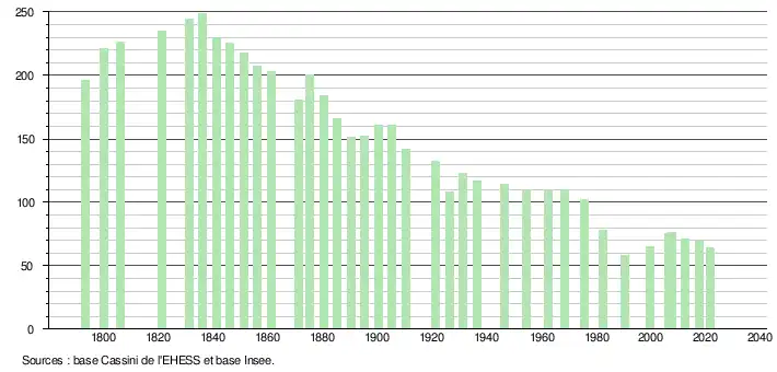 L'évolution du nombre d'habitants est connue à travers les recensements de la population effectués dans la commune depuis 1793. Pour les communes de moins de 10 000 habitants, une enquête de recensement portant sur toute la population est réalisée tous les cinq ans, les populations légales des années intermédiaires étant quant à elles estimées par interpolation ou extrapolation[18]. Pour la commune, le premier recensement exhaustif entrant dans le cadre du nouveau dispositif a été réalisé en 2007[19].