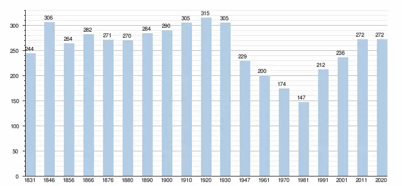 Durant l'ensemble du XIXe siècle, le territoire de l'ancienne commune de Guirsch[5] a connu une relative stabilité de sa population totale. À partir des années 1920, celle-ci va toutefois commencer à diminuer comme dans la plupart des espaces ruraux. Entre 1920 et 1981, la population va diminuer de 53 %[6]. La tendance va toutefois s'inverser à partir des années 1980 : la population va croître de 147 (1981) à 280 habitants (2016). Cette augmentation récente de la population est concomitante à un processus de rurbanisation qui s'accompagne de la construction de nombreuses habitations.