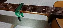 Un capodastre sur une guitare. - le plectre, ou médiator ou encore pick en anglais (« pic » au Québec), est une lamelle (en plastique, ou plus rarement en écaille, en os, en bois) plus ou moins épaisse utilisée pour gratter ou pincer les cordes avec une attaque plus forte qu'avec les doigts ou les ongles ;