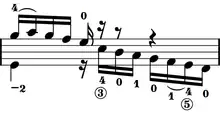 Pour guider le musicien, une partition pour guitare peut être surchargée par des indications de doigté :