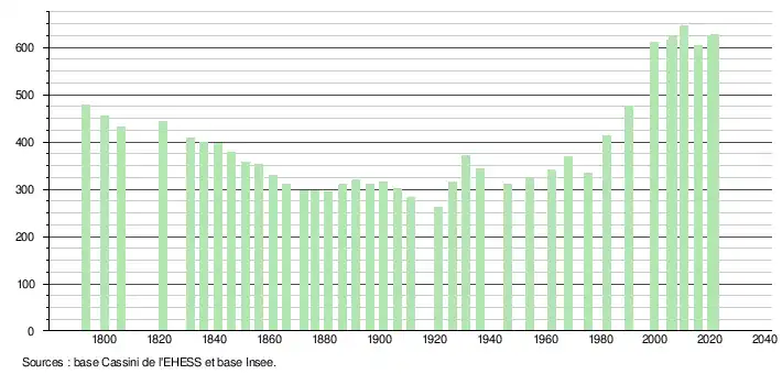 L'évolution du nombre d'habitants est connue à travers les recensements de la population effectués dans la commune depuis 1793. Pour les communes de moins de 10 000 habitants, une enquête de recensement portant sur toute la population est réalisée tous les cinq ans, les populations légales des années intermédiaires étant quant à elles estimées par interpolation ou extrapolation[23]. Pour la commune, le premier recensement exhaustif entrant dans le cadre du nouveau dispositif a été réalisé en 2005[24].