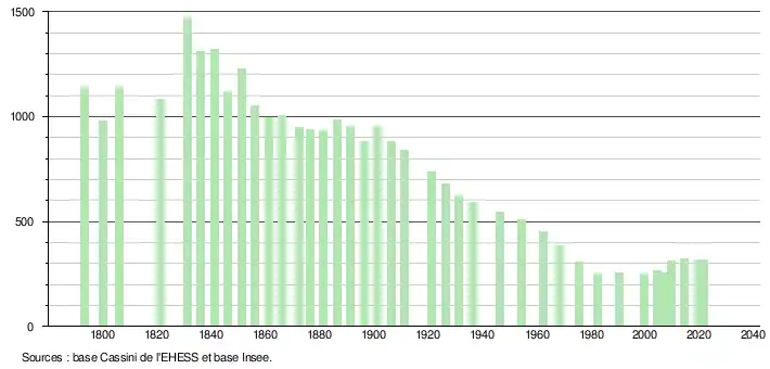 L'évolution du nombre d'habitants est connue à travers les recensements de la population effectués dans la commune depuis 1793. Pour les communes de moins de 10 000 habitants, une enquête de recensement portant sur toute la population est réalisée tous les cinq ans, les populations légales des années intermédiaires étant quant à elles estimées par interpolation ou extrapolation[15]. Pour la commune, le premier recensement exhaustif entrant dans le cadre du nouveau dispositif a été réalisé en 2004[16].