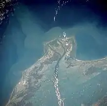 Comme l'indique la NASA[12], « <cette région> est typique des grands deltas de la côte sud-est de l'Inde (dite « côte de Coromandel ») : lits filamentaires, plaine inondable immense et interminables bancs de sable indiquent que ce tronçon de la Krishna draine un relief relativement plat et charrie un volume de sédiments considérable, surtout en période de mousson. »