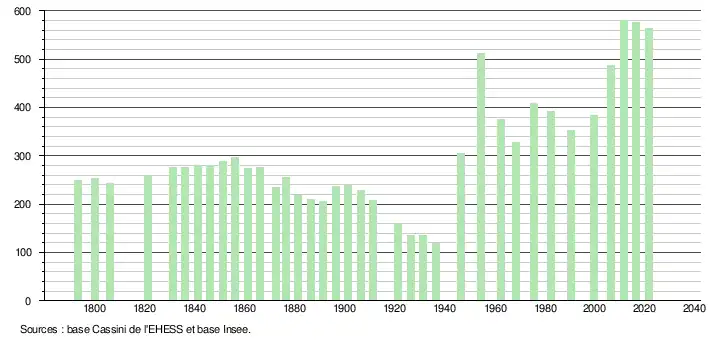 L'évolution du nombre d'habitants est connue à travers les recensements de la population effectués dans la commune depuis 1793. Pour les communes de moins de 10 000 habitants, une enquête de recensement portant sur toute la population est réalisée tous les cinq ans, les populations légales des années intermédiaires étant quant à elles estimées par interpolation ou extrapolation[40]. Pour la commune, le premier recensement exhaustif entrant dans le cadre du nouveau dispositif a été réalisé en 2006[41].