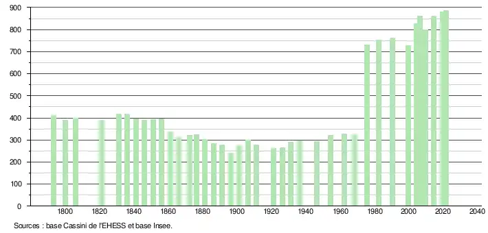 L'évolution du nombre d'habitants est connue à travers les recensements de la population effectués dans la commune depuis 1793. Pour les communes de moins de 10 000 habitants, une enquête de recensement portant sur toute la population est réalisée tous les cinq ans, les populations légales des années intermédiaires étant quant à elles estimées par interpolation ou extrapolation[48]. Pour la commune, le premier recensement exhaustif entrant dans le cadre du nouveau dispositif a été réalisé en 2004[49].