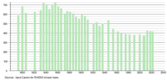 - Population municipale légale en vigueur au 1er janvier 2024, millésimée 2021, définie dans les limites territoriales en vigueur au 1er janvier 2023, date de référence statistique : 1er janvier 2021.