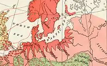 Fort de ce postulat, il admet que la dispersion des populations indo-européennes se fait lors des périodes tardives du Néolithique[14], lors de quatorze raids menés par une caste guerrière minoritaire[15], qu'il affirme être en mesure de dater[13]. Ainsi, il s'intéresse aux traces laissées par la culture rubanée et par celle de la céramique cordée[16]. Dans le même mouvement, reprenant les thèses du préhistorien Ludwig Wilser (de)[17] et sous l'influence du romantisme allemand et de sa conception du Volksgeist[N 4],[18],[19], Kossinna situe le berceau originel des populations germaniques dans le Nord de l'Allemagne actuelle[20].