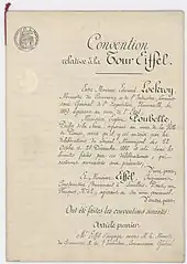 Convention signée le entre Édouard Lockroy, ministre du Commerce et de l'Industrie, Eugène Poubelle, préfet de la Seine, et Gustave Eiffel, ingénieur-constructeur, qui précise l'emplacement, ainsi que les modalités de construction et d'exploitation de la tour de 300 mètres. Archives nationales F/12/3770.