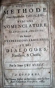 - Guy Miege, A new Dictionnary French and English..., Londres, (lire en ligne), : « It is now come to pass, that French Tongue is in a manner grown Universel in Europe, but especially amongst the Gentile part of it. » cité par Jean Pruvost, «Dictionnaires monolingues au double public depuis 1680 et dictionnaires culturels. », La linguistique 1/2012 (Vol. 48), p. 19-35