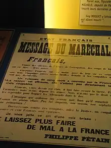 Des exécutions d'otages avaient déjà eu lieu depuis le début du mois de septembre (voir : Les Allemands et la politique des otages), mais l'annonce, après l'attentat de Nantes, des dix-sept exécutions de Nantes, des vingt-sept de Châteaubriant et des quatre de Paris, et surtout la menace d'une deuxième vague de cinquante nouveaux otages, crée un choc énorme en France et dans le monde[75],[76]. Le 24 au matin, Pétain confie à son chef de cabinet, Henry du Moulin de Labarthète, qu'il pense à se constituer prisonnier pour devenir le seul otage[77]. Dans la journée, son entourage l'en dissuade[75], en particulier les ministres Darlan, Romier, Moysset et surtout Pucheu[77]. L'historien Robert Aron, pourtant souvent indulgent vis-à-vis du maréchal commente « Il n'accomplit pas ce geste qui, selon certains, aurait fait de lui un personnage de légende […] ce qui est certain, c'est que le silence officiel du maréchal, ne protestant pas contre de telles atrocités, a accentué le divorce entre l'opinion et Vichy[78]. »