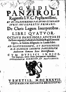 - 1578 : (la) Consiliorum sive responsorum juris D. Guidi Panciroli,... liber primus. Opus... nunc primum in lucem editum...
