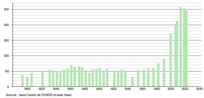 L'évolution du nombre d'habitants est connue à travers les recensements de la population effectués dans la commune depuis 1793. Pour les communes de moins de 10 000 habitants, une enquête de recensement portant sur toute la population est réalisée tous les cinq ans, les populations légales des années intermédiaires étant quant à elles estimées par interpolation ou extrapolation[28]. Pour la commune, le premier recensement exhaustif entrant dans le cadre du nouveau dispositif a été réalisé en 2008[29].