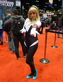 Cosplay de Spider-Man entouré de Gwen Stacy (à gauche) et Mary Jane Watson (à droite). | |