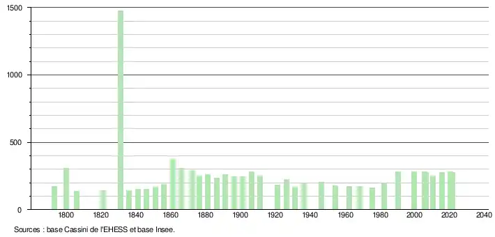 L'évolution du nombre d'habitants est connue à travers les recensements de la population effectués dans la commune depuis 1793. Pour les communes de moins de 10 000 habitants, une enquête de recensement portant sur toute la population est réalisée tous les cinq ans, les populations légales des années intermédiaires étant quant à elles estimées par interpolation ou extrapolation[26]. Pour la commune, le premier recensement exhaustif entrant dans le cadre du nouveau dispositif a été réalisé en 2005[27].