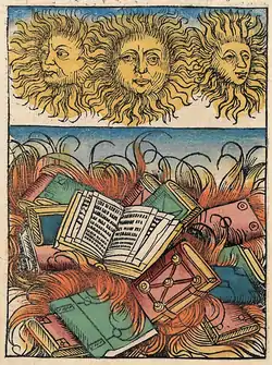 C'est alors qu'il est accusé de troubler l'Église en mêlant condition monastique et condition maritale[74]. C'est donc par Héloïse que les ennemis d'Abélard trouvent prise pour le discréditer, en l'accusant par voie de lettre ouverte d'entretenir sa femme avec les honoraires de son enseignement tout en restant moine[74]. Héloïse est insultée et dénoncée tout en même temps comme une innocente victime et une fille de joie[74]. Roscelin va jusqu'à reprocher au professeur son sceau, qui le représente formant un seul corps avec sa femme[74],[n 30]. En 1121, c'est le grave échec du concile de Soissons. Abélard est condamné sans débat[23] pour sabellianisme à livrer lui-même sur le champ un exemplaire de sa Théologie du souverain bien, « traité de l'unité et de la trinité divines », à un autodafé[76]. L'ouvrage serait contraire à l'article 20 du symbole de Sirmium de 351, et ce en dépit du fait qu'il est conforme au symbole de Nicée qui précise, sinon corrige, le précédent.