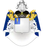 Sur le blason : franc-quartier ou franc-canton d'azur, chargé d'une muraille crénelée d'or. Ornements extérieurs : Toque de velours noir, retroussée de contre-hermine, avec porte-aigrette or et argent, surmonté de cinq plumes d'argent. |