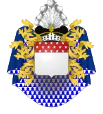 Sur le blason : franc-quartier ou franc-canton sénestre échiqueté de gueules et d'or. Ornements extérieurs : Quatre lambrequins d'argent. Toque de velours noir, retroussée de contre-vair, avec porte-aigrette argent, surmonté de trois plumes d'argent. |